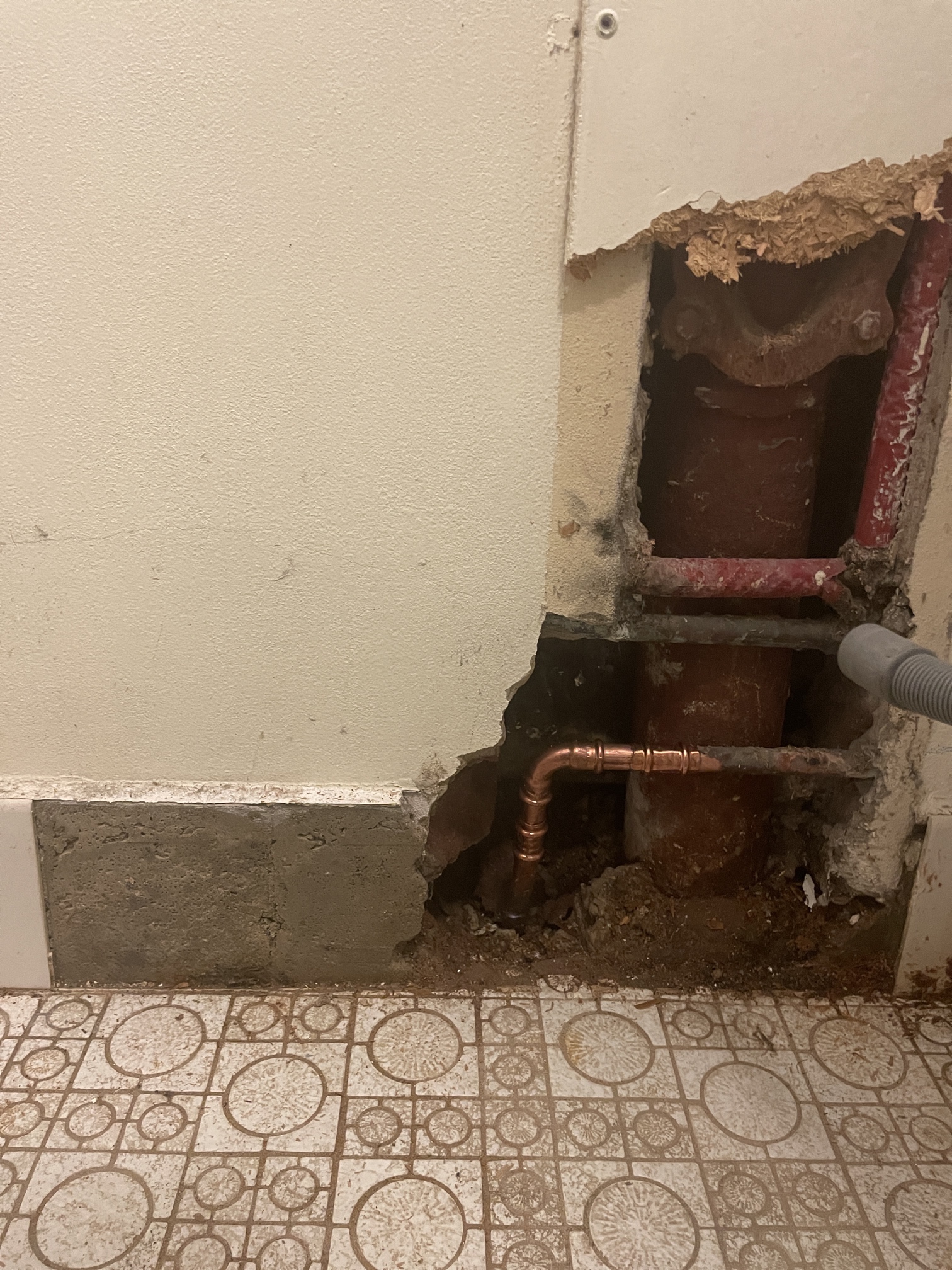 (before the unit isolation valve). Works completed to resolve the leaking pipe - Before actioning the works, a notification to strata was made informing that the water supply will be off to the building for the majority of the day, once the leak had been found. Utilising a jackhammer, a section of brick work was removed to gain access into the cavity in order to find the damaged section of pipe. Once the affected pipe was located, we cut out the damaged section and supplied and installed it with a new pipe. On completion of the works - Testing on completion of works took place, once the new section of pipework was installed to ensure it was all in working order